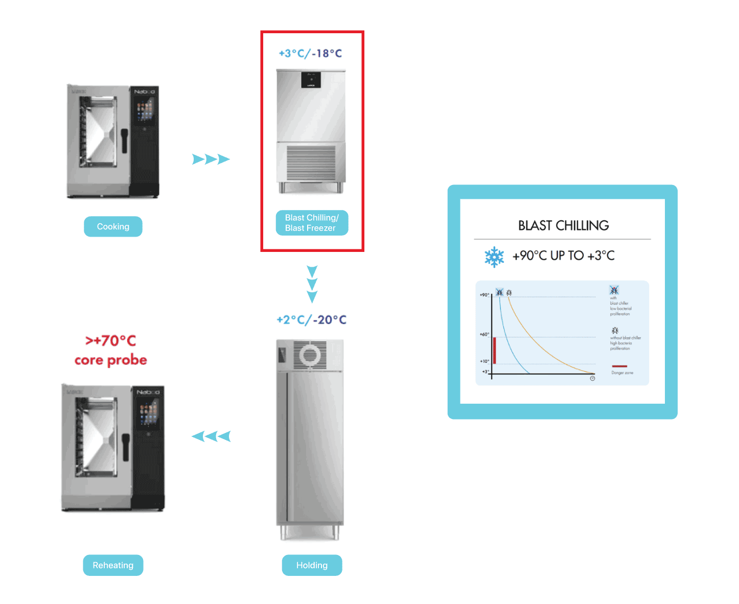 Blast chiller operates by cooking first, then proceeds with either blast chilling or blast freezer in a temperature range between + 3ºC / - 18 ºC. Later, proceeds to holding it at + 2ºC / - 20 ºC temperature range before proceed for reheating at +> 70ºC.