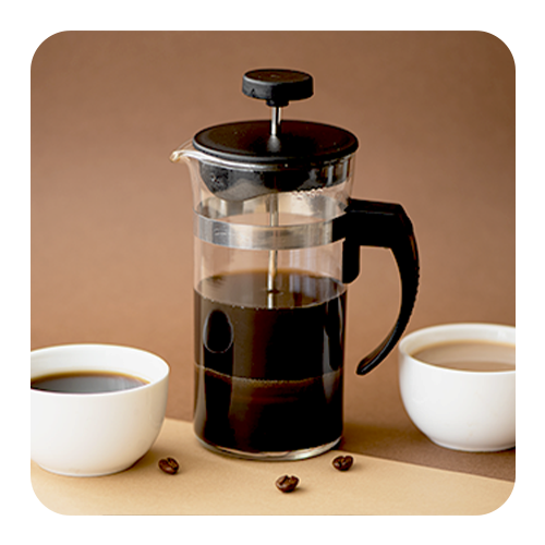 Technique: Coarsely ground coffee is steeped in hot water, and after a few minutes, the plunger is pressed, separating the grounds from the liquid.