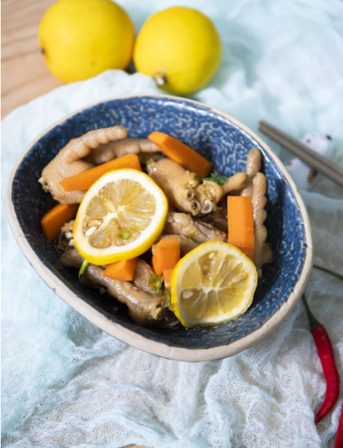 4. Pour into a bowl, stir with lemon, coriander, and carrots. You can also put it in the refrigerator with plastic wrap. The chicken feet will taste better after refrigeration.