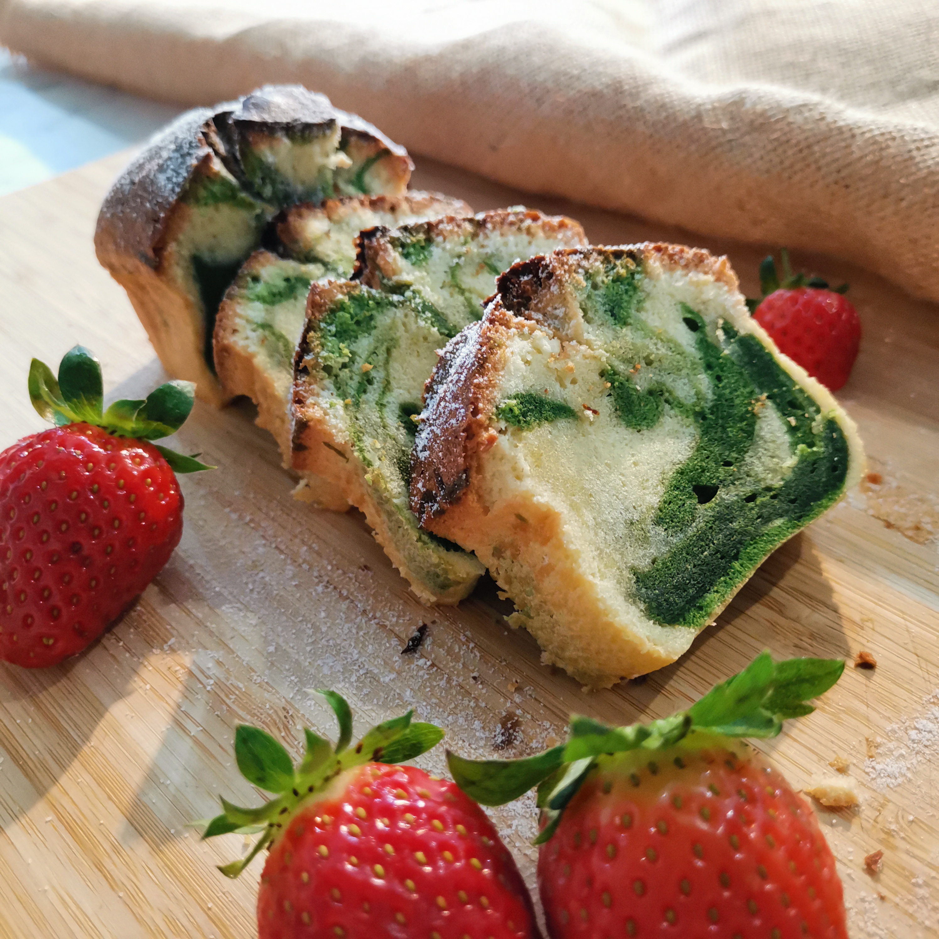 6. Place the original better and the matcha batter alternatively into lined cake tin. Use a skewer or fork to swirl it around the mixture to make marble effect. Tap the tin gently to remove any air bubbles