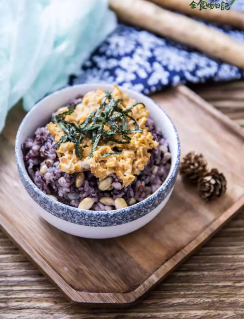 4) 调好的酱汁淋在五谷米饭上,撒上海苔切条即可。