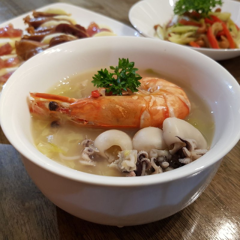 4. Add prawn and baby cuttlefish into the cooking container and cook for 10 minutes / 110 degrees / 10 minutes / Reverse rotation / Stir.