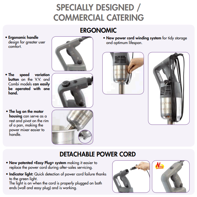 Functions: intermittent, continuous and according the model, variable speed designed for a better user comfort and speed control flexibility according to the preparation.