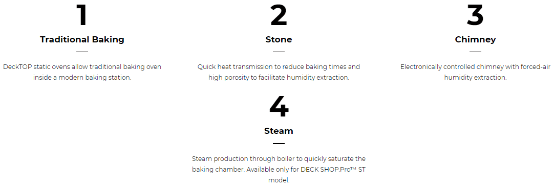 Designed for all bakery masters eager to complete a BAKERLUX SHOP.Pro™ baking station with a static oven, DECK SHOP.Pro™ is capable of great things without the need for extra space. DECK SHOP.Pro™ opens up a world of possibilities in baking, and delivers outstanding results with large breads, leavened desserts, pizzas and focaccias and traditional confectionery products.
